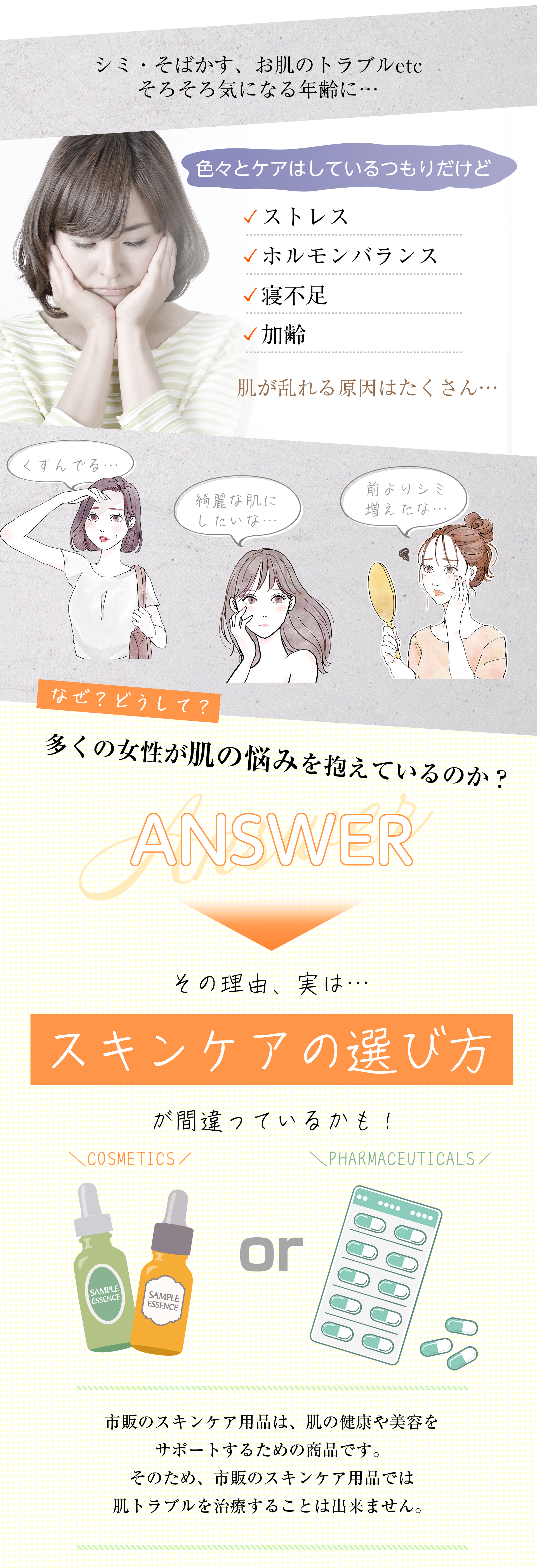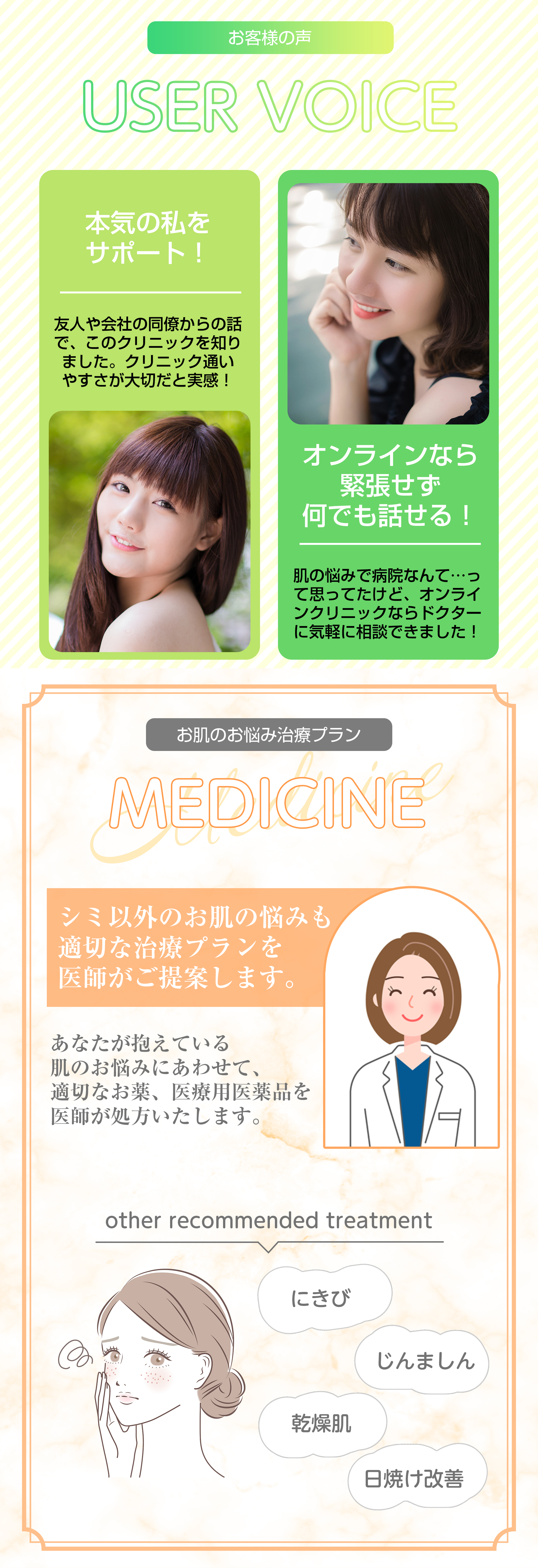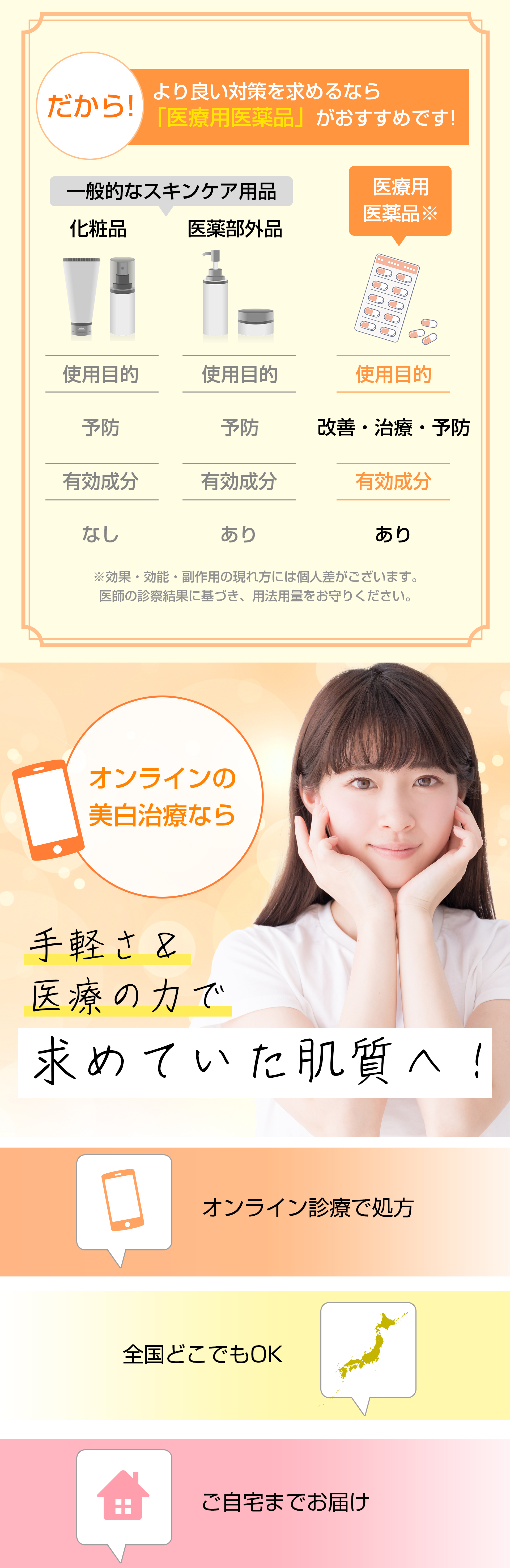 美肌のプロである医師が監修。お手持ちのスマホやパソコンを通してお肌の状態を診断します。あなたのお肌に必要な医薬品を処方し、ご自宅までお届けするサービスです。